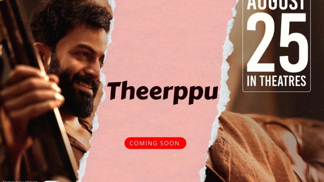 Theerppu movie is an experimental movie directed by Rathish Ambat and written by Murali Gopi . Prithviraj, Indrajith and Saiju are playing the leading roles in the film. Vijay Babu, Isha Talwar and Hanna Regi Kosi are the other lead actors in this film. Film produced by director Ratheesh Ambat, writer Murali Gopi and actor Vijay Babu.